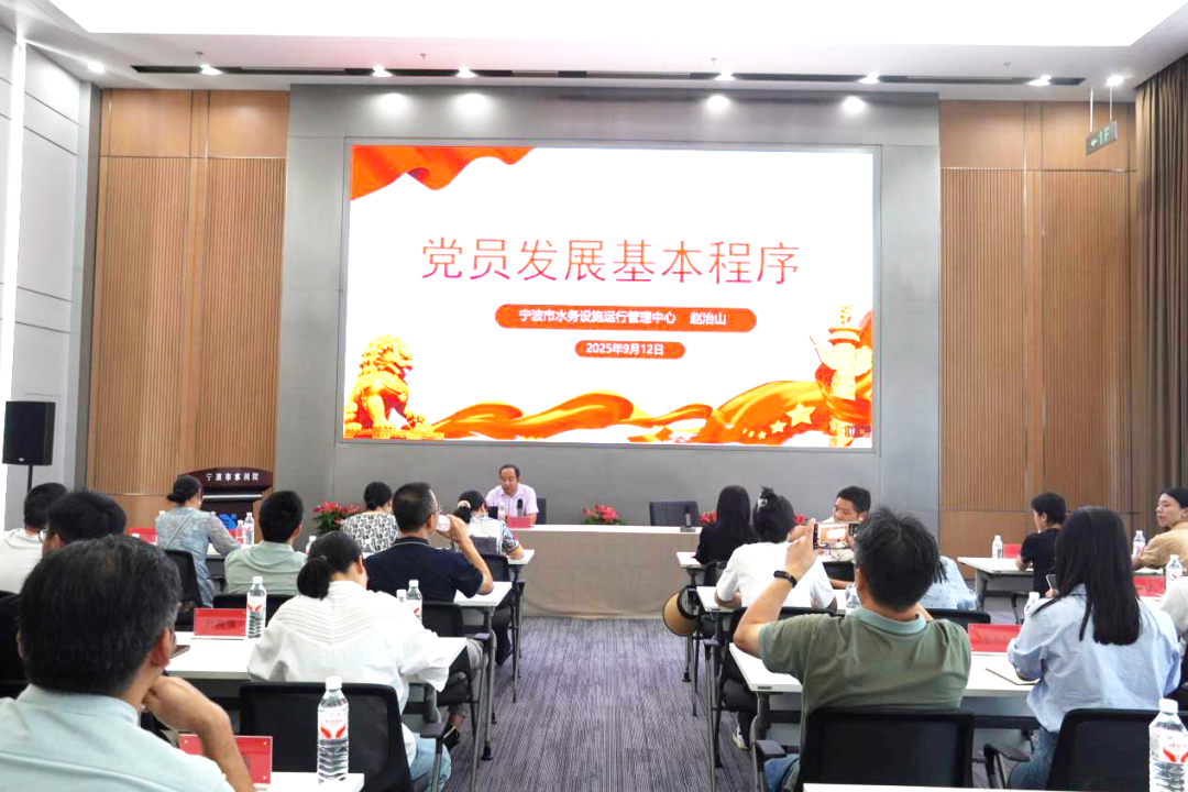 2025年9月12日上午,中共寧波市水利局直屬機關(guān)委員會在我院一樓報告廳成功舉辦黨務(wù)干部培訓(xùn)。本次培訓(xùn)以“銘記抗戰(zhàn)歷史 傳承紅色基因 賦能水利發(fā)展”為主題,旨在進(jìn)一步提升全局系統(tǒng)黨務(wù)干部的政治素養(yǎng)和業(yè)務(wù)能力,夯實基層黨組織建設(shè)基礎(chǔ)。寧波市水利局系統(tǒng)各基層黨組織組織委員近三十人參加了培訓(xùn),我院相關(guān)黨務(wù)干部一同參與。