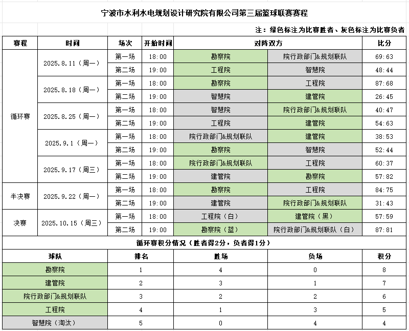 八月盛夏,激情點(diǎn)燃。寧波市水利院第三屆"智慧杯"職工籃球聯(lián)賽在集士港體育公園籃球場火熱開幕!這不僅是一場競技的較量,更是一次寧波院人團(tuán)結(jié)拼搏、斗志昂揚(yáng)的集中展現(xiàn)。經(jīng)過兩個(gè)月的鏖戰(zhàn),最終勘察院隊(duì)強(qiáng)勢(shì)問鼎冠軍,建管院隊(duì)與院行政部門&規(guī)劃聯(lián)隊(duì)分別獲得亞軍、季軍?,F(xiàn)在,就讓我們一同回顧這段充滿汗水與激情的籃球時(shí)光!