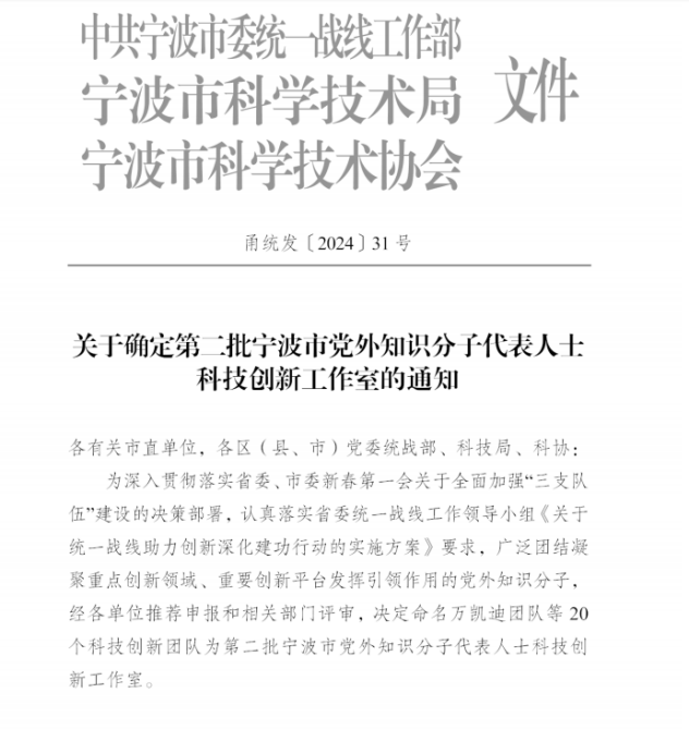 近日,寧波市統(tǒng)一戰(zhàn)線助力創(chuàng)新深化建功行動啟動儀式在寧波院士中心舉行。啟動儀式上,市委常委、統(tǒng)戰(zhàn)部部長林雅蓮為第二批寧波市黨外知識分子科技創(chuàng)新工作室團隊授牌。寧波市黨外知識分子科技創(chuàng)新工作室由市委統(tǒng)戰(zhàn)部會同市科技局、寧波市科協(xié)認定。我院張預(yù)定創(chuàng)新工作室位列其中。