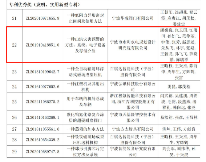 近日,寧波市市場(chǎng)監(jiān)督管理局公布了第三屆寧波市專利創(chuàng)新大賽獲獎(jiǎng)項(xiàng)目名單,我院提交參賽的發(fā)明專利“一種山洪災(zāi)害預(yù)警的方法、系統(tǒng)、電子設(shè)備及存儲(chǔ)介質(zhì)”榜上有名,獲得本次大賽的“專利優(yōu)秀獎(jiǎng)(發(fā)明、實(shí)用新型專利)”。